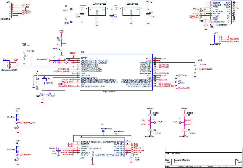 de chez Microchip comme système numérique. Pour le hacheur 4 quadrant, nous avons utilisé le L298 de ST microelectronics dans une version initiale mais nous nous sommes tournée vers un onduleur triphasé avec diodes de roue libre intégrés (que nous utilisons en hacheur 4 Q) le L6234 dans la version "light" que nous présentons ici .